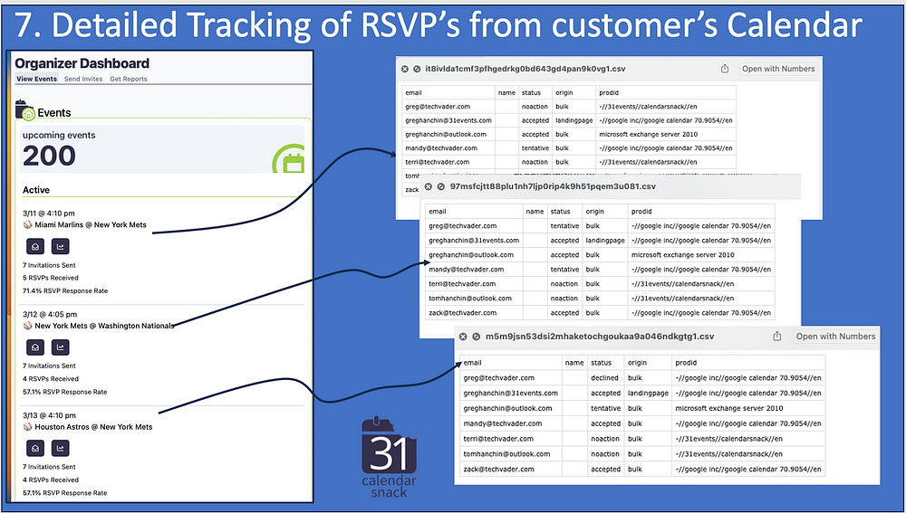The customer enters an email and receives a calendar invite, and the RSVP receipts are in the reporting console for each Event.