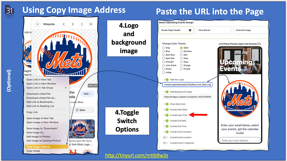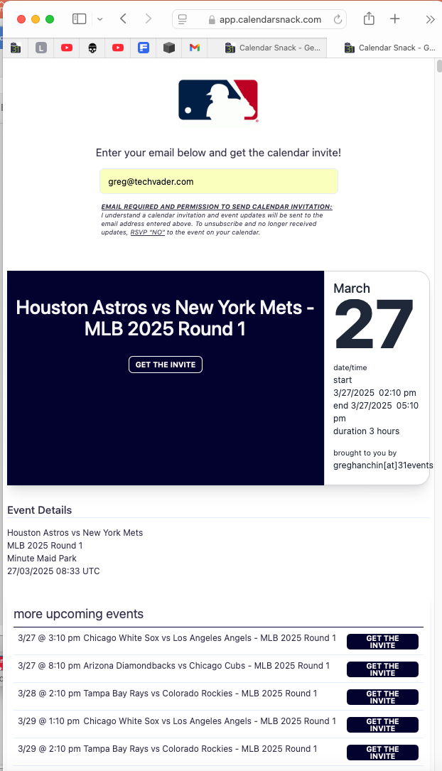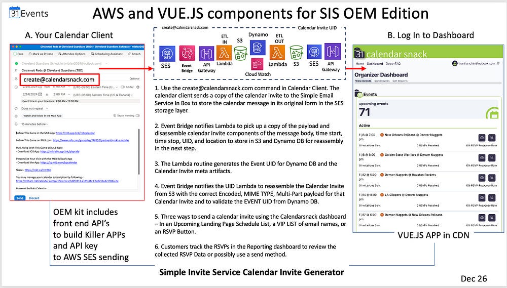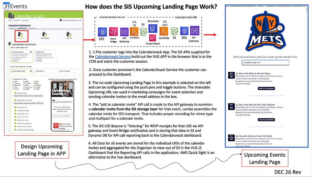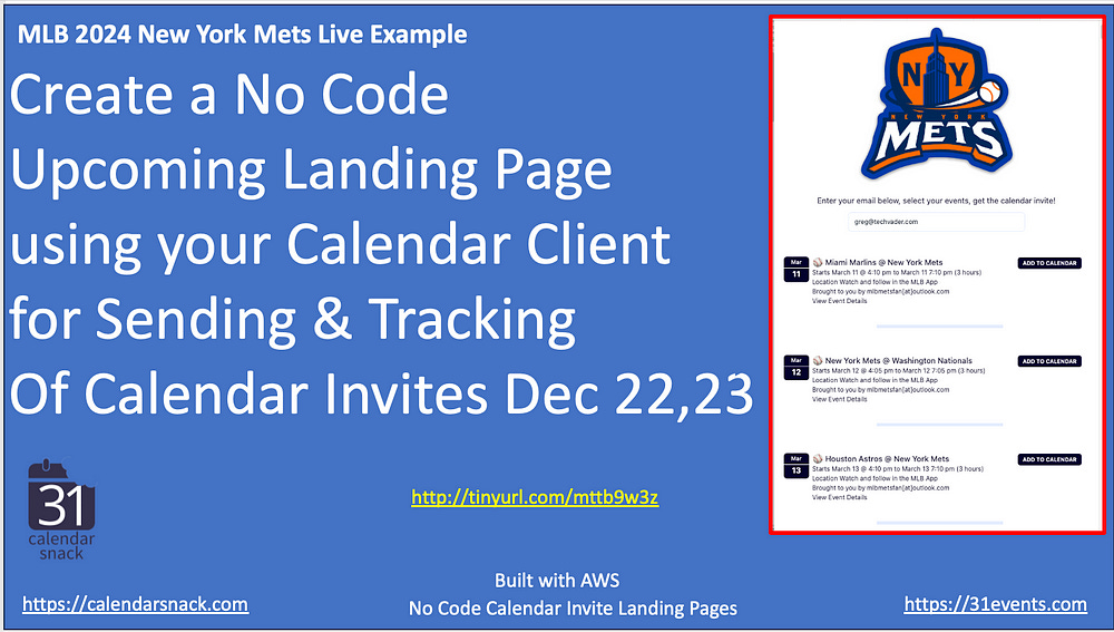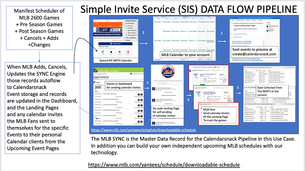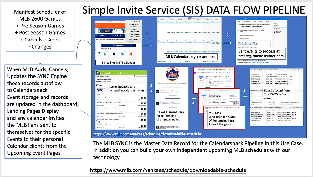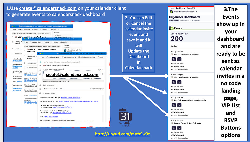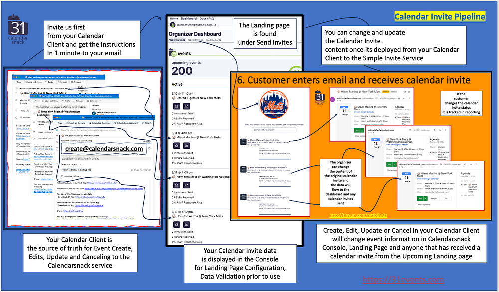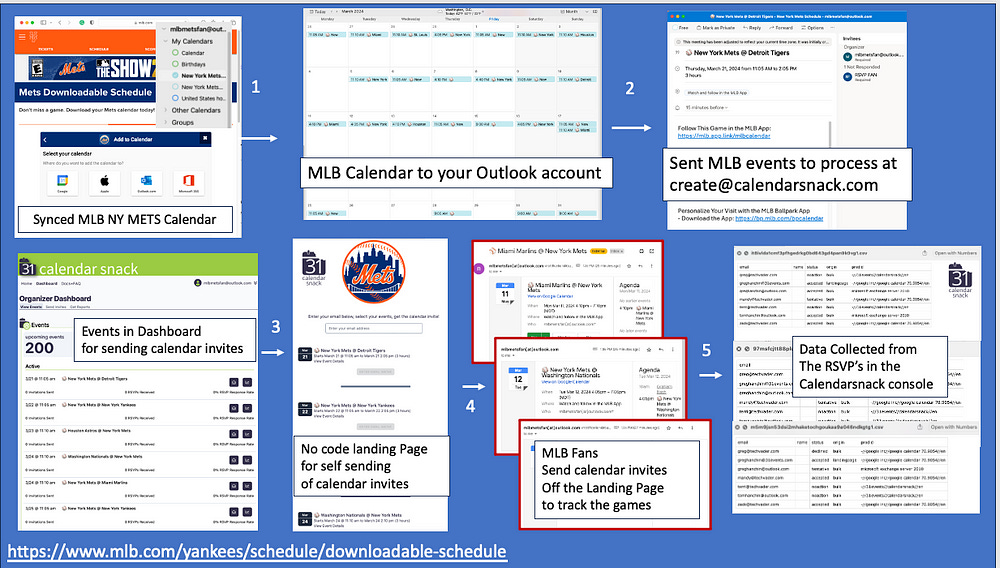 1-MLB Calendar Sync to NY Mets to Outlook Calendar Client> 2- create@calendarsnack.com of MLB events in calendar client to calendarsnack dashboard> 3-Generate No Code Upcoming Landing Page in Dashboard > 4-Customer Sends Calendar Invite for MLB Game from Landing Page> 5-RSVP’s Tracked