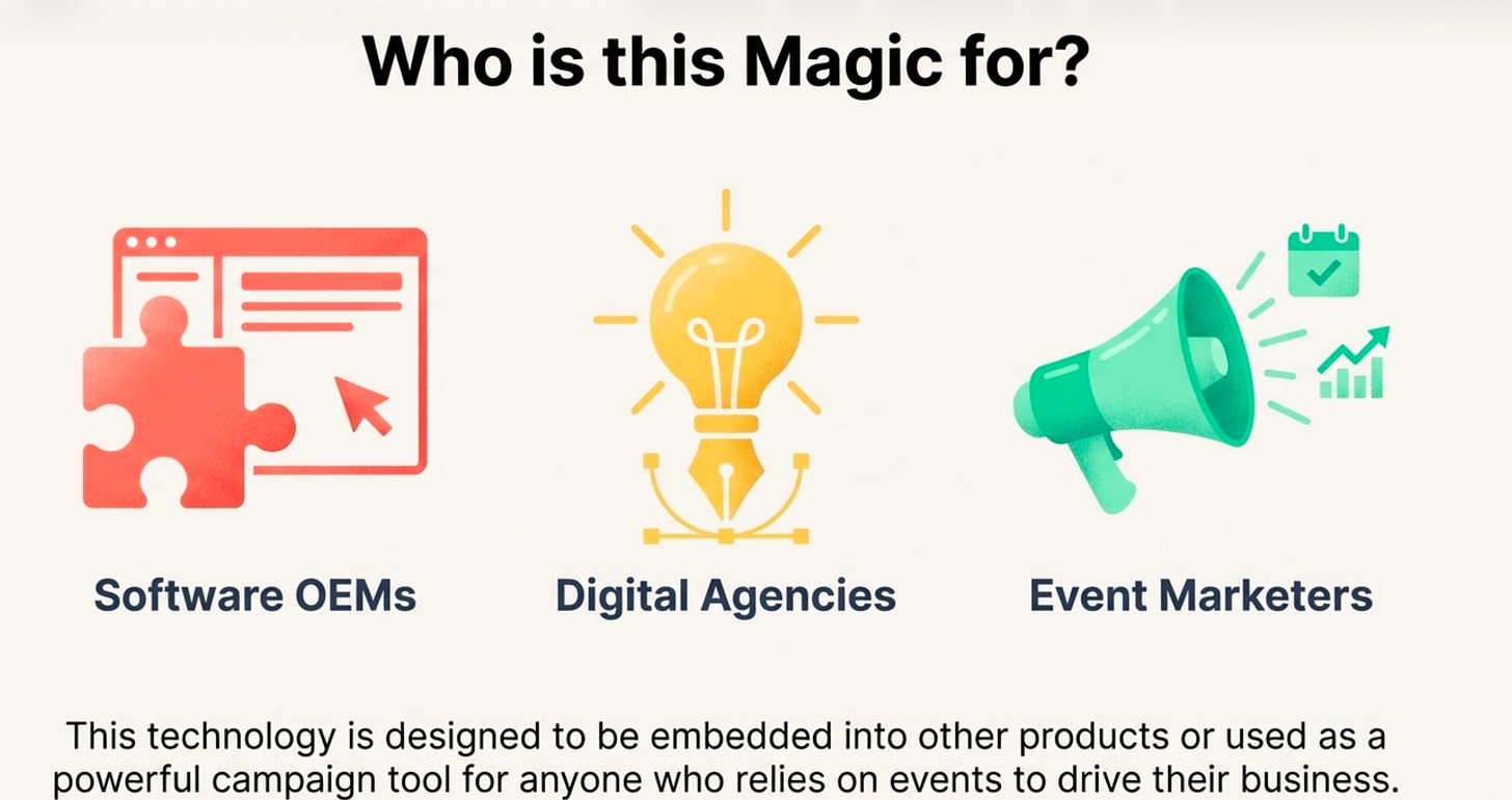This entire pipeline is built on a serverless AWS stack, including API Gateway, SES, DynamoDB, and Lambda, and is available as a deployable Cloud Formation installer. The whole system, powered by nine distinct APIs, is designed not just for end-users but as a platform for Software OEMs, Digital Agencies, and Event Marketers to build their own custom solutions.