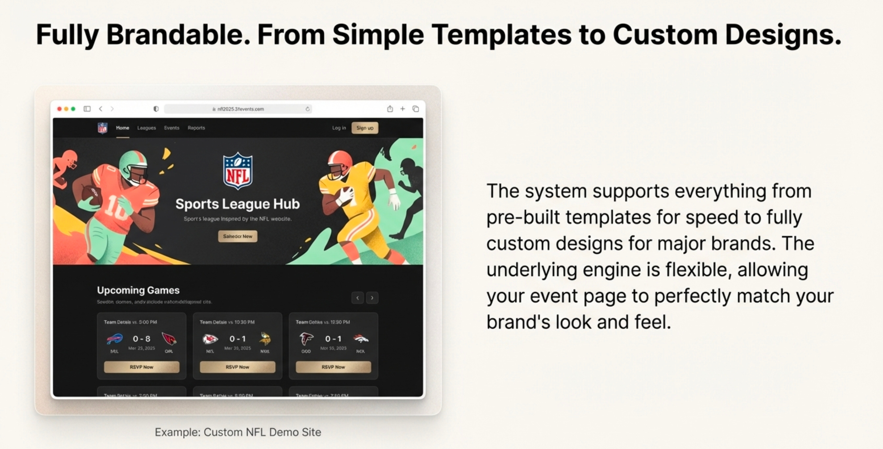 These pages can be built from templates or receive custom designs for specific brands, as demonstrated by this powerful example for the NFL, including creating and displaying multi events which follow the same workflow and added to the page in chronological order.