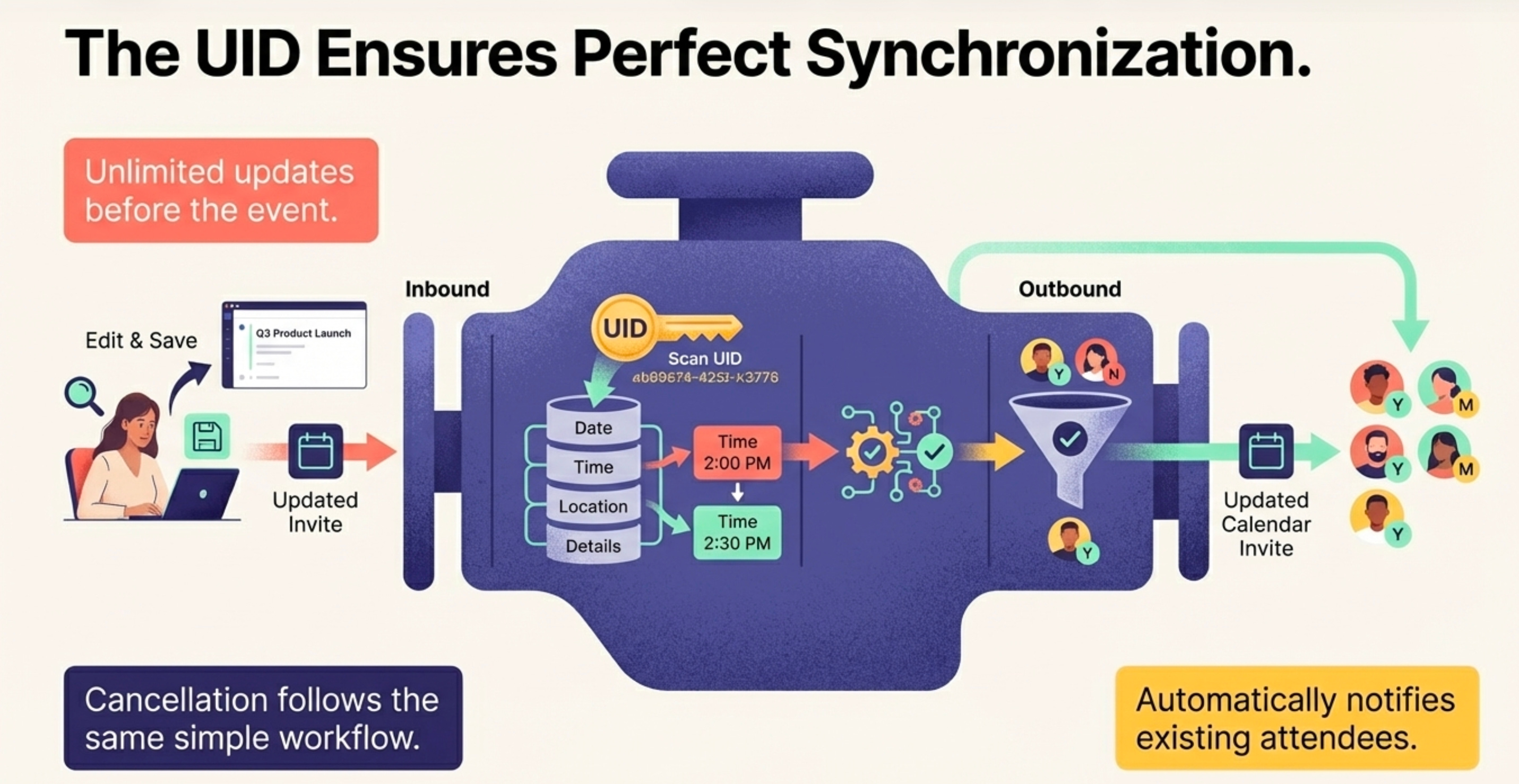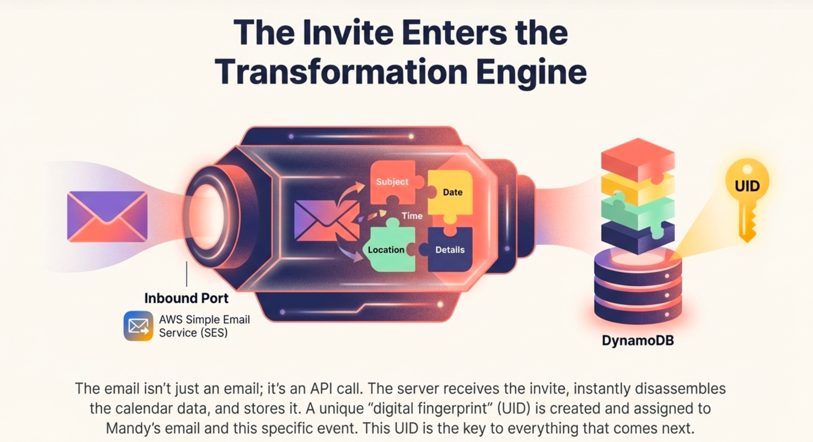 Behind the scenes, the system disassembles the calendar data and stores it in a database, assigning it a Unique Identifier (UID) linked directly to Mandy’s email address. This UID is the critical thread that connects the organizer, the event, the landing page, and all subsequent communications into a single, cohesive workflow.